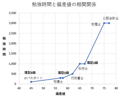 このように、難易度の高い(偏差値の高い)資格試験ほど、合格に必要な勉強時間も多くなっています。