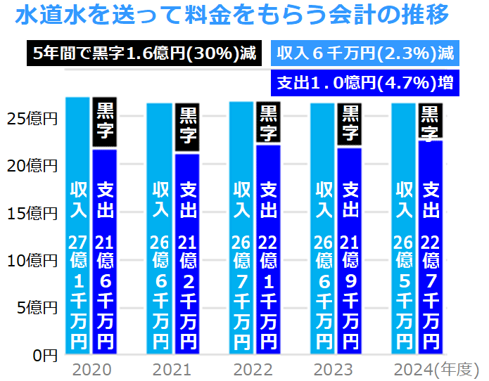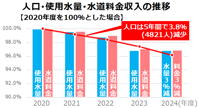 人口減少の影響で、水道使用水量が減少し、水道料金収入の減少が続いています。一方で、物価高騰の影響で支出が増加しています。