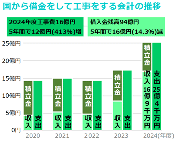 国から借金をして工事をする会計は、工事費が16億2千万円、借金の返済が9億2千万円となり、前年度より8億6,233万円増加しました。工事費の財源には補助金や借入金を充て、借入金の返済には積立金を取り崩しました。