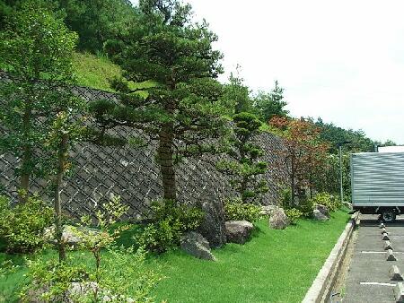 | 工場の敷地内から出てきた石を用いて駐車場背面のスペースを緑化しました。工場の方が芝の手入れを綺麗にされていて気持ちのいい空間です。殺風景なブロック土留めも樹木の背景として機能しています。松はオーナーの自宅から移植しました。 |