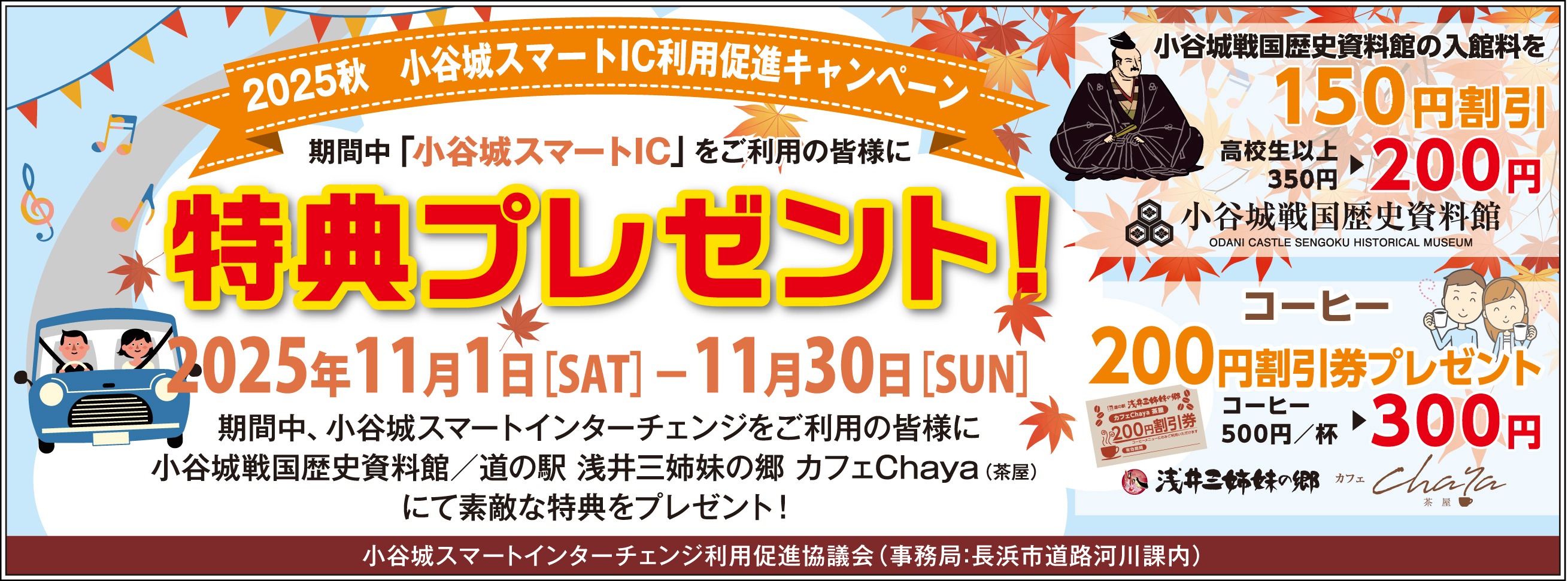 2025年10月31日 期間中、小谷城スマートインターチェンジをご利用の皆様に 【道の駅 浅井三姉妹の郷】 カフェChaya茶屋にてコーヒー割引券(200円割引)をプレゼント! 【小谷城戦国歴史資料館】 入館料大人(高校生以上)を割引 350円 → 200円 【期間】令和7年11月1日(土)~11月30日(日) 【キャンペーンに関するお問い合わせ】 小谷城スマートインターチェンジ利用促進協議会へ (事務局:長浜市道路河川課内 0749-65-6531) ![]() (長浜市のHPを参照する)