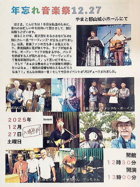 大和郡山城小ホール 入場無料 仲間と一緒に出演します。