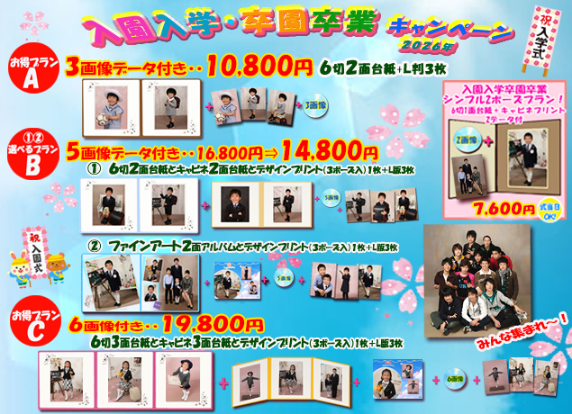 | 素敵な笑顔を未来に・・ 卒業入園入学写真の予約受付中! 春に七五三は超お得・・早撮りキャンペーン実施中! 七五三 新緑香る 春のロケーション撮影もお勧め! ★初宮参り,七五三のロケーション撮影 ご予約受付中!(大人気) 何処よりもお得で最高の写真を目指して21年! 当店はお客様の待ち時間ゼロ、完全貸切制です。 各種証明写真もお任せ下さい オーデション等もお任せ下さい。是非 ご検討下さ。 |