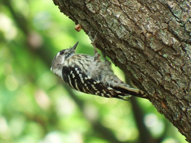 全長15cm(13〜15cm) で、スズメと同じくらいの大きさ。翼開長は約27cm。体重18〜26g。日本に生息するキツツキとしては最も小さい。オスよりメスがやや大きい。灰褐色と白のまだら模様の羽色をしている。南方に分布するものほど体色が濃くなる傾向がある。雌雄の羽色の違いは後頭部にある赤い斑の有無(雄にある)程度だが、野外ではほとんど見えないため、羽色で雌雄を区別することは困難なことも多い。足には前指2本と後指2本がある。