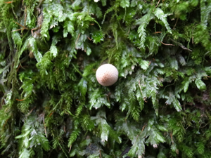 球形のキノコで、基部に柄がない。
