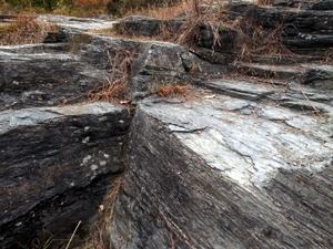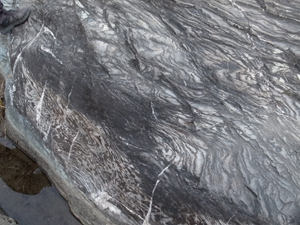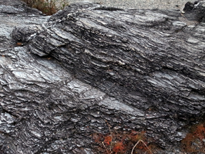 岩石のしま模様(片理)が直線的に曲がっている