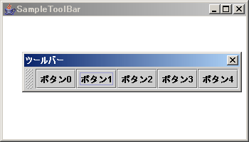toolbar = new JToolBar("ツールバー"); JToolBarのインスタンスを生成しています。 ツールバーが切り離されたときにタイトルに”ツールバー”と設定されます。 |