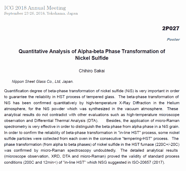 Spontaneous breakage of tempered sheet glass is caused by volume expansion during beta-phase transformation of Nickel Sulfide. The Nickel Sulfide is one of the most dangerous defects. Heat Soak Test has been carried out as one of the effective solutions for the reduction of spontaneous breakage. It is important that we quantitatively analyze the degree of beta-phase transformation of Nickel Sulfide in manufacturing process, in order to guarantee the reliability of in-line continuous Heat Soak Test. For fine-grained Nickel Sulfide in the fractured origin, the crystallographic evaluation by mapping method using micro-Raman spectrometry will be shown in the presentation.