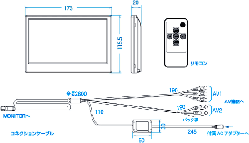 - 防犯カメラなどの映像を映し、一般的なモニターとして使用するほか、リバースランプと連動させることでバックモニターとして使用することもできます。