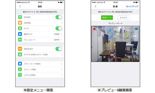 フレームレートなどの設定ができます。また、PC-300Wの記録映像データをスマホやタブレットにてWiFi接続が可能です。映像のモニタリングや解像度やスマホにダウンロードできます。