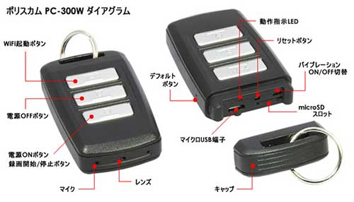ポリスカムPC-300Wは、WiFi機能を新たに搭載した第6世代リモコンキー型デジタルビデオカメラです。スマホやタブレットでWiFi接続が可能、専用アプリで映像のモニターや録画のON/OFFができます。500万画素デジタルCMOSイメージセンサーを搭載し、高精細で色鮮やかに描画します。