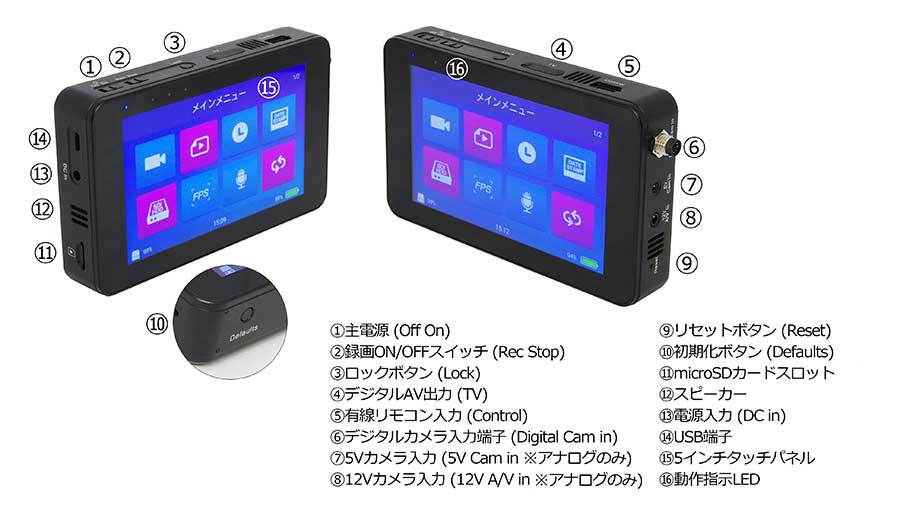 | 入力端子 | 専用デジタルCMOSカメラ入力 x 1、アナログ入力φ2.5(DC5V供給) x 1、 アナログ入力φ3.5(DC12V供給) x 1 ※3 |