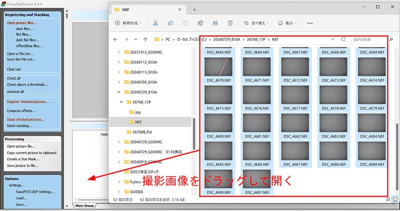 ここでは、2023年7月29日にε180+D810Aで撮影した13P/Olbers彗星を例にあげます。このときの撮影は、ISO1600で30秒露光で撮り、気温は28℃、画像はDSC4640からDSC4691まで52枚あります。52枚のNEFファイル(RAWデータ)をDSSの下部にウインドウにドラッグします。