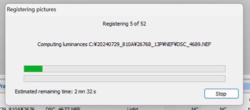 D810Aの元画像を52枚Registarするだけでしたら、私のパソコンで2分程度で終わります。