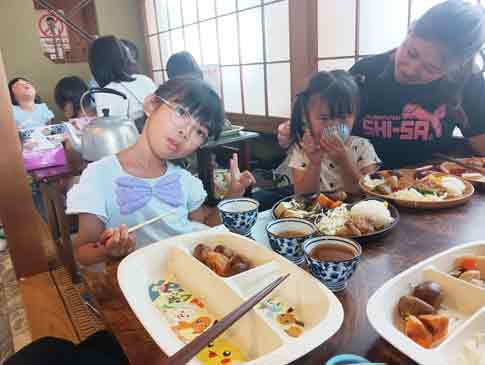 | あさひ食堂 令和5年9月23日(土) (チキンカレー、かぼちゃの煮付け、マカロニサラダ、みかん、おはぎ、おかし) ペーロン城でかぼちゃをたくさんいただいたので、煮物にしました。今日の子供食堂は、家族中で何組か来てくれました、【ボランティアさんが少ないので、手伝ってください】と大きな声で呼びかけると、お父さん達が動いてくれました。ありがとう!!、おはぎは片岡さんがお彼岸の日なので作ってくれました、さあ みんなで【ありがとう】【ごちそうさま】 |