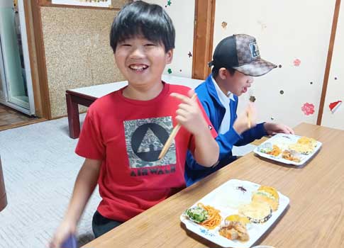 | 令和5年 12月14日(木) 古池食堂 ファミリーマート&むすびえ様よりいただいたお米券で新米を買いました。 メニューは サツマイモご飯・大根サラダ(大根、人参、シーチキン)ほうれん草のごま和え・ミカン、子供達から「ごはんおいしい」「おかわりしてもいい」の声がとびかいました。 美味しい物を食べると自然に笑顔があふれます。 |