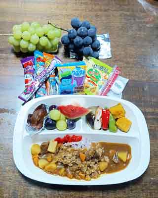 古池食堂 令和5年9月28日(木) (ハヤシカレー、かぼちゃの煮付け、ポテトサラダ、かまぼこ、フルーツ、バナナ、おかし) じゃがいもをいただいていたのでポテトサラダとカレーに。COOPさんからの、かまぼこをかざりました。おかしも沢山いただき春日井製菓さんのグミも子供達にくばりました。フルーツもおいしい、今日のカレーおいしいねと、ボランティアさんが検食でいただきました。 おいしいー おいしいー、まんぞくじゃー。 |