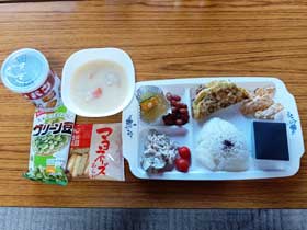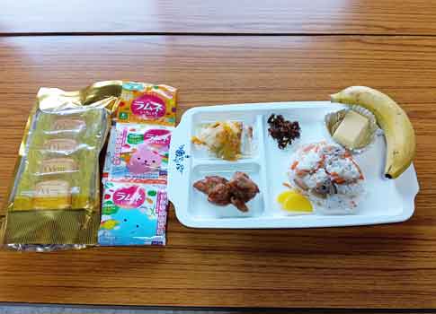令和7年2月27日(木) 古池食堂 今日のメニュー。 五目ごはん、とり肉、フライドチキン、すじ肉煮(だいこん、レンコン、たまご) ほうれん草ごまあえ、そうめんサラダ、バナナ、おかし。 あさひ食堂に続いて、古池食堂も災害用炊き出し五目ごはんを食べてもらいました。子ども達に 「1月17日防災の日で防災給食だったよね」 「今日の五目ごはん 、災害用炊き出しごはんです」 「相生市危機管理課より賞味期限がまじかになっている、災害用五目ごはんをもらったんだよ」 「防災の日の防災給食を思い出し、災害用の五目ごはん食べてみてください」 「いただきます」 今日のおかずは、子ども達にと支援者の方から、いただいた、野菜、とり肉、そうめん、バナナ、おやつ、飲み物だよ 感謝して食べようね |