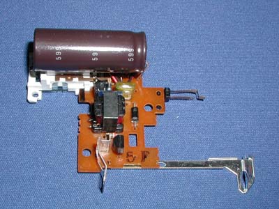 フラッシュユニット。 以前、同じようなフラッシュ・ユニットを使って、開けると閃光で威嚇する貯金箱を作ったものの、接点部分に高圧が掛かるため、ひどい目に遭った!! 何かいろいろと使えそうな予感はあるものの、既に2年間以上放置・・・。 |