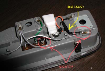 6.配線が終わったらコネクターを接続してLEDが点灯しているのを確認して元の場所にはめ込みます。 今回、LEDには微少な電流しか流していないので、昼間はほとんど判りません。 |