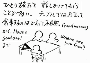 ユースホステルの食堂や列車のなかでひとりで座っていると、たくさん現地のひとに話しかけてもらえます。英語が苦手などと言ってられません。ここではみんなが会話を楽しむことは当然のことのようでした。山やユースホステルで出会ったひとと気軽に Hello! や Hi! と言葉を交わせてもらえるのも この土地の暖かさだと感じました。ユースホステルのテーブルで向かい合わせになったのに 話かけないなんて考えられないことでした。