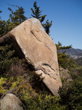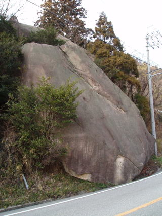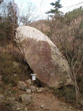 | 1995年1月17日の阪神大震災のときに 荒地山から落下した岩。 岩の上に白く見えるのは、 弥生時代に記された中国古代文字の ロンサン文字といわれている。(文献@) |