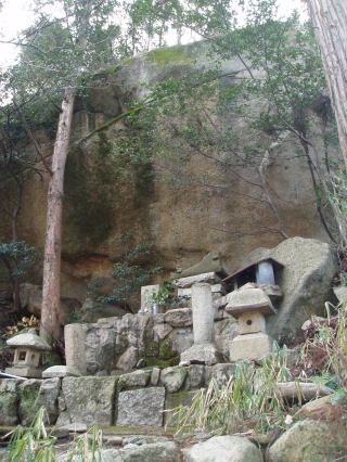 | 弁天岩 (磐座・福石) 諸説を総合すると、弁天岩は四つの巨石の総称で次のように分類される。 1 磐座 最上部の弁才天を祀る岩 2 福石 上段、中段、下段からなる 三つの巨石 上段、下段の岩は中段の 岩に比べはるかに大きく 夫婦岩と呼ばれる。(文献B) 弁才天は、もともとインドでは河川の神であったが、日本古来の水神信仰と結びついて水の神となり、水辺にまつられるようになった。 宝暦10年(1760)の記録に「弁才天芦屋村打出村立会之山内に有り」とある。 この弁才天を祀る水神社は、明治41年に麓の芦屋天神社(現芦屋神社)に合祀され、現在も境内の古墳内に祀られている。 (文献C) 場所: 芦屋と有馬を結ぶ芦有(ろゆう)ドライブウェー沿いの芦屋ゲート近くにある。 石の宝殿系列 鱶切り岩 (まな板岩) 場所:弁天滝 弁天岩のすぐ近く |
