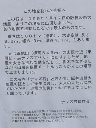 | <参照文献> @ナマズ石保存会のサイト http://5525.ld.infoseek.co.jp/index.html#2 A六甲摩耶 西宮明昭山の会編 ゼンリン 2000年刊 p49 B自然環境ウォッチング「六甲山」 兵庫県立人と自然の博物館 「六甲」研究グループ編 神戸新聞総合出版センター 2001年刊 p71〜75参照 |