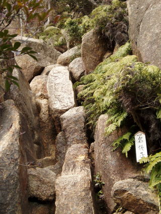 | 白い表札のかかる岩梯子 | 岩梯子の上から見下ろしたところ | |