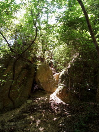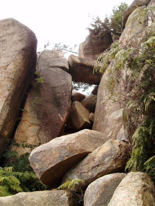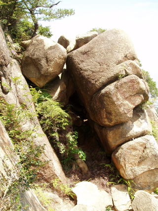 | 七右衛門嵒(穴) 昔、荒地山の岩梯子の上の登り道に七右衛門嵒(ぐら)と呼ばれる人一人がやっと通り抜けられる岩穴が立ち塞がっていた。登山者は、その穴をくぐって荒地山の山頂に向かった。 その岩穴が、1995年の阪神大震災でつぶされ左側に新道ができた。しかし、最近になって昔の七衛門穴が復旧されつつある。まだ穴は開通していないが、この穴を再び通ることができるのも近いかもしれない。 岩の間から漏れる日の光は神々しい。 場所:荒地山 |