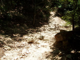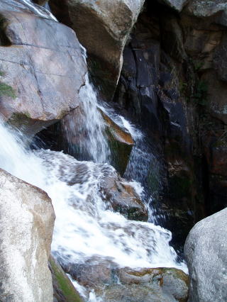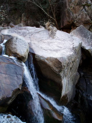 | 小便岩 (根性岩) この岩は、流れの右側をボルタリング風に左足を50cm上に乗せ、両手を左の上のほうにつかみ、右足を岩の方まで挙げて登るのに根性がいることから、根性岩とも呼ばれている。 場所:地獄谷 小便滝。ここより右に登ればA懸垂岩下に出る。 |