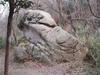 | 蛙岩 古書によれば蛇巻岩(じゃまきいわ)とも呼ばれていたそうである。 そう言われれば、岩の上部が蛇の頭、下部がとぐろを巻いているように見えてくる。 正反対の見方が面白い。 さらに古い昔の絵図をみると「狼岩」と記されているそうである。(文献C参照) これに関して、下記のおもしろい民話を見つけた。 場所: 魚屋道 会下山遺跡付近 <参照文献> @「新しい六甲山」 山下道雄著 山渓文庫12 1962年刊 p151 A「六甲ー摩耶ー再度山路図」 直木重一郎著 関西徒歩会 1934年刊 B芦屋の民話 三好美佐子著 1999年刊 p70〜75 芦屋市立図書館蔵書 Cあしや子ども風土記 伝説・物語 芦屋市教育委員会 1992年刊 p53 「かえる岩の伝説」の末尾参照 |