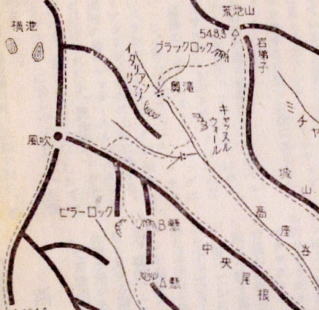 | <推定理由> @「六甲ハイキング」 大西雄一著 1963年版 p42 説明図 今の風吹岩のあたりは道だらけで、上記の説明図に記載された道が今のどの道を指すのかを特定することは困難である。しかし、当該の岩は、ともかく道を挟んで風吹岩と対向する形で記載されている。 A古地図『六甲ー摩耶ー再度山路図』 直木重一郎著 関西徒歩会 1934年刊には、風吹岩(屏風岩)と表記されており、風吹岩と屏風岩が同一のものとして表記されている。このことは、風吹岩と屏風岩が同一のものと見なされる程接近していることを意味し、状況と一致する。 B「六甲」 竹中靖一著 朋文堂 1933年刊 p400に次の記載がある。 『山の神から東方に高座谷を見ながら尾根伝いに行けば、やがてやや急な登りとなり、登り切ったところの右側に壁状をなした屏風岩がある。・・・・・・屏風岩の後から東に派生している尾根は、ロックガーデンの中央を貫き高座瀧まで延びている』 |