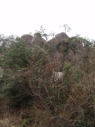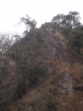 | 樹林の上に岩の先端が覗く。 | 金網に覆われた岩 | |||