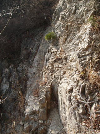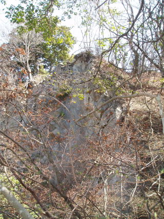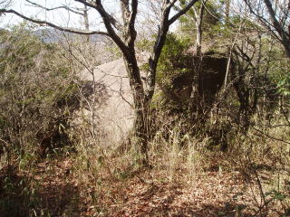 | 大谷乗越 屏風岩 上記の細ヶ谷の右岸に当たる尾根の反対側(西側)に広がる屏風状の岩である。岩も崩れ樹木も茂り迫力はまったくない。 かっては、屏風のように折り曲がった岩肌が東西に広がっていたのだろうか。 場所:屏風岩の位置は、参考文献の@とAでは位置が異なっている。 私が探査した結果では、古地図@の位置(古地図Aよりかなり下側)にそれらしき岩は発見できなかった。従って、古地図Aの位置を正しいものとして採用した。 |