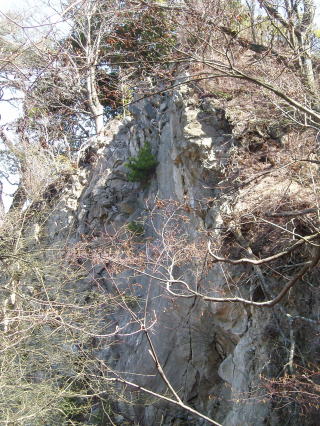 | 剣岩 1937年刊の古地図(六甲北摂ハイカーの径 木藤精一郎著)を見ると、東六甲縦走路の宝塚市最高峰の岩原山の南に細ヶ谷と呼ばれる谷がある。その谷の左岸に剣先のように鋭くとがった岩がある。 場所:上記 |