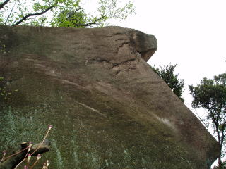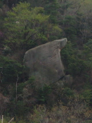 | 芦屋川 烏帽子岩 烏帽子には様々な種類があって、これは恵比寿さんが被っている風折り烏帽子である。 『西摂大観』に「岩石の形状恰も烏帽子に似たるを以て名つく、芦屋川の上流夫婦岩に至る間路の右側に聳立し、いまや墜落せんとするの状勢なるより、之を仰き看るもの自ら心胆を寒ふす」とある。 この岩は古くから知られていて、 寛延3年(1750)の山論裁許状にもその名が見える。 場所:ごろごろ岳の芦有ドライイブウェー側山腹 旧発電所の送水管の北側。 |