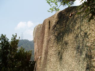 | 肉薄して撮影。 指の先端部分が空に突き出ている。 岩の下部はコンクリートで芦有ドライイブウェーを護るための崩落防止の処置がしてある。 |
