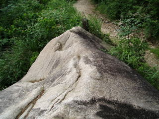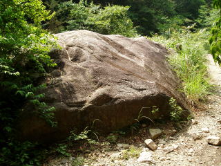 | 老ヶ石(大石) 触れると老けるといわれる巨大な老ヶ石 この岩には「血を流した老ヶ石」というおもしろい民話(目次7)がある。 これについて、柴田昭彦氏の綿密な研究報告がある。 「ものがたり通信 」老ヶ石の伝説 場所:船坂谷中流 林道の終点 |