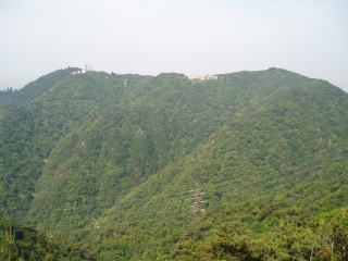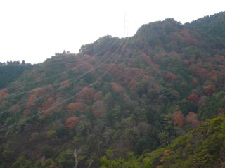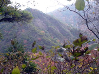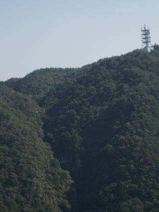 | 左の写真:かなりぼやけているが、一番左に見えるのが一枚目の岩壁、その右の二つの尾根に挟まれたのが二枚目の岩壁、ほとんど見えないが送電線鉄塔の下あたりが三枚目の岩壁。 つまり、三枚岩は山頂から尾根筋に並んだ三つの岩壁である。 |