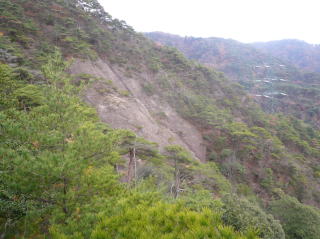 | 三枚岩 (天狗岩場) 新穂高にある岩壁がなぜ三枚岩と呼ばれるのか疑問であったが、読者の方から詳細な情報をいただいた。 『六甲の谷と尾根』によると .「三枚岩は西六甲ドライブウェイが石楠花山南端を大きく迂回するあたりからはっきりと眺められる大きな岩壁である。 三枚の岩で出来ている為この名前がある。」とある。 参考文献:『六甲の谷と尾根』 石上隆章(中村勲編集、やまゆき会事務局発行、昭和60年) p161、162 場所:国土地理院 2万5千分1地図 神戸首部「三枚岩」と六甲岩石大事典 第2部1章「天狗岩場」参照。 尚、国土地理院の地形図では、三枚岩は尾根上に描かれているが、正確には写真のように斜面に広がった露岩である。 三枚岩の全体を眺める時も、新穂高に登る時も、送電鉄塔が良き目印となるので、地図にて確認すること |