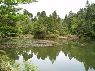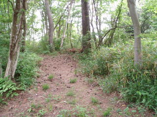 | 鍋蓋山 天狗岩 私は岩を捜す場合、よく地図に記載された送電線を利用する。 今回も、古地図に記載された天狗岩の位置が、直線距離で、鍋蓋山の頂上と有馬街道にかかる天王吊橋の距離の半分であることを確認した。それを、国土地理院の2万5千分の1地図に当てはめると、そこに送電線が走っていることが分かった。 さらに、古地図によれば、この辺に尾根の分岐があり、天狗岩はこの左右の尾根の股の付け根あたりにあることが分かった。 以上の予備知識のもとに岩の探索をすると、鍋蓋山から送電線を少し下った登山路沿いにかなり大きないくつかの岩を容易に見出すことができた。 この中で、天狗様の気持ちになって、一番高所にある見晴らしのよい場所にある岩を天狗岩と推定した。 さらに気付いたことは、古地図に記載された鍋蓋山から天王吊橋に降りる道がほぼ直線的に西に走っているのに対し、国土地理院の道は南西方向にかなり迂回していることである。このことから、現在のルートは天王ダムの建設時?に新しく作られた道であることが判明した。そして、旧道のなごりが、写真の尾根の分岐にあることが分かった。 |