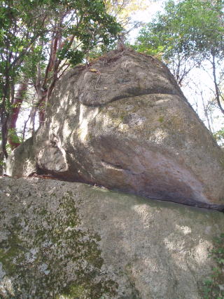 | 多聞寺系列 修行岩 (清盛の涼み岩) シュラインロードを下りきった北側に古寺山と言ういかにも何かありそうな山がある。 それで、今日も色々な調査で忙しい行程であったが、どうしても寄り道したくなり、その山に登った。 道はややこしく、所々に「本堂跡」、「護摩堂跡」の表示板がかかっている。 昔ここに多聞寺という寺があり、平清盛が福原に都を移したときに都の鬼門(北東)護る寺として大切にした。その後、源平合戦で源義経が一の谷を攻める時に、その道案内を断ったために焼き払われそうである。 頂上には、写真のような岩が鎮座していた。 場所:古寺山山頂 道に迷いやすいので注意のこと。 |
