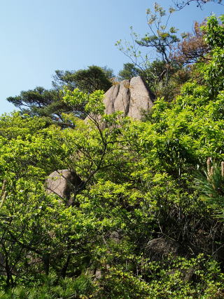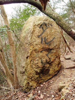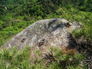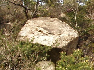 | バッタ岩 遠くから眺めると山腹に 巨大なバッタが 潜んで居るみたいだ。 場所:荒地山道畦谷山腹 南の尾根のルートから 藪こぎ(かなり大変で 危険) |