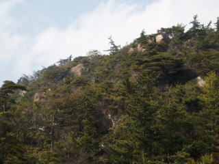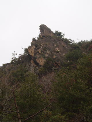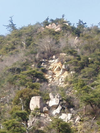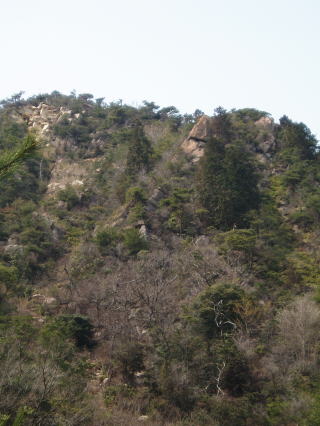| 荒地山道畦谷東尾根より見たはげ岩。 上方の岩が手を広げたように見える。 |