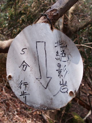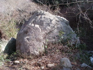 | 航空母艦岩 この巨岩は、道畦谷の入口に鎮座している。 前部は船の舳先のようであり、 上部は、航空母艦の甲板のように 平らだ。 場所:荒地山道畔谷入口 |