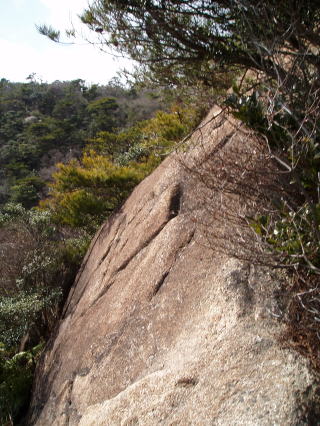 | 傾き岩 ここは、人があまり来ない静かな岩のテラスだ。 眼下に広がる緑は多彩に変化し、緑のシンフォニーを奏でる。 場所:荒地山中部中腹 水場のある小屋のルート |