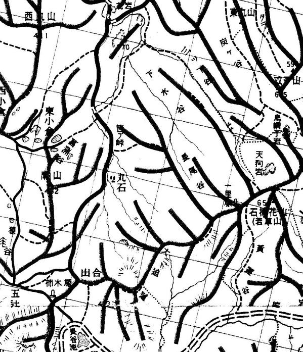 直木地図は、等高線が描かれていないために尾根筋と谷筋で判断する。