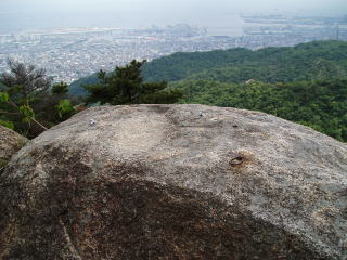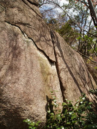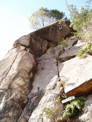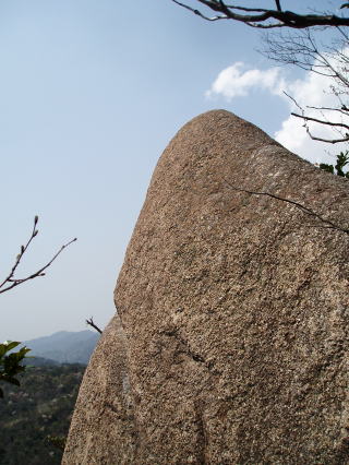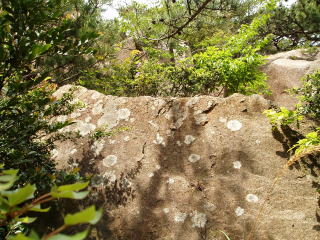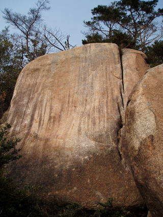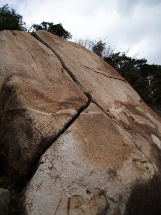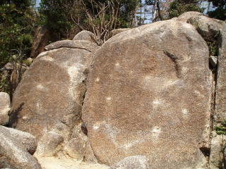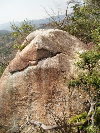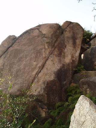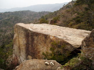 | 岩小屋から見た正面、縦にクラックが走る。 | 岩の頂部。深江の浜が見える。 | |