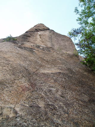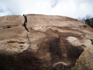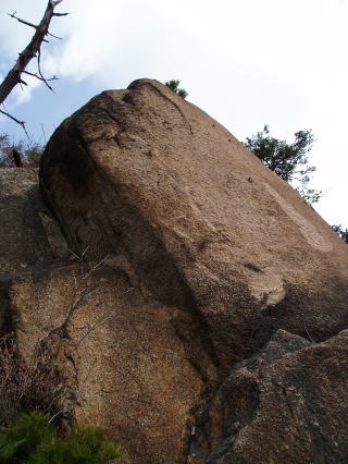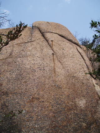 | (5) フィンガー マジック 4m 崩壊 ハングしたフェースに走る左上する弓なりのクラック。 最初はオフハンド(幅約3cm) 屈曲点はフィスト(幅約10cm) そこから、クラックはさらに細くなる。 場所:荒地山の肩に至る登山路の左手にある。頂上近く、マップよりもかなり山側にある。 立ち枯れた、白い木が目印。 |